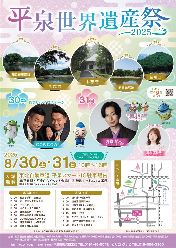 平泉世界遺産祭 三彩館ふじせい2025年8月31日2025年8月31日 未分類 Tags:平泉 来年2026年は、世界遺産登録15周年です。 登録は、東日本大震災で大打撃を受けた直後の6月。 全国から多くの皆さまが、支援のために東北を訪れてくださり、 私共にとっては言葉に尽くせぬほど有難いことでした。😂 今、平泉町では5年ぶりとなる世界遺産祭が開催中です。 世界自然遺産の小笠原諸島など県内外の世界遺産をPRするコーナーもあり、 ご当地グルメなど約50のブースが並び大好評とか。 今日31日まで平泉スマートインターチェンジ駐車場で開かれています。 お時間のある方は、ぜひどうぞ! 関連する雑記帳 平泉の世界遺産 一関・平泉もち街道 旅気分 萩まつり あやめまつり 一関・平泉もち街道形成セミナー 萩まつり 6月26日 三彩館ふじせいのフブログ... 平泉 ← 虫の声 おろし餅 →