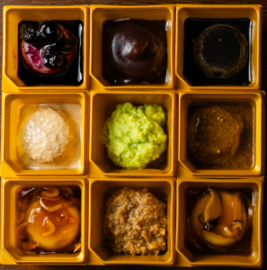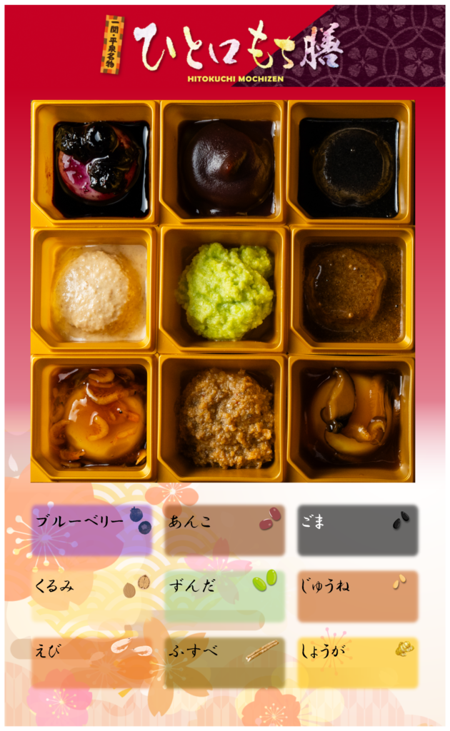 ふじせいの「ひと口もち膳」の特徴である、ひと口サイズでたくさんの伝統もちを召し上がっていただける形はそのままに、お土産用としてブルーベリーとえびが加わりました♪